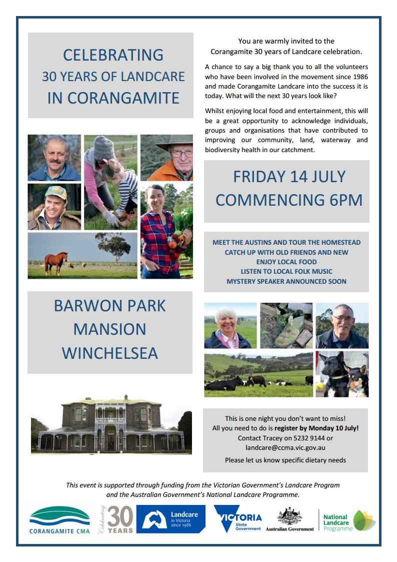 Celebrating 30 years of Landcare in Corangamite - all welcome to come along and celebrate on Friday 14 July at Barwon Park Mansion in Winchelsea. RSVP essential.