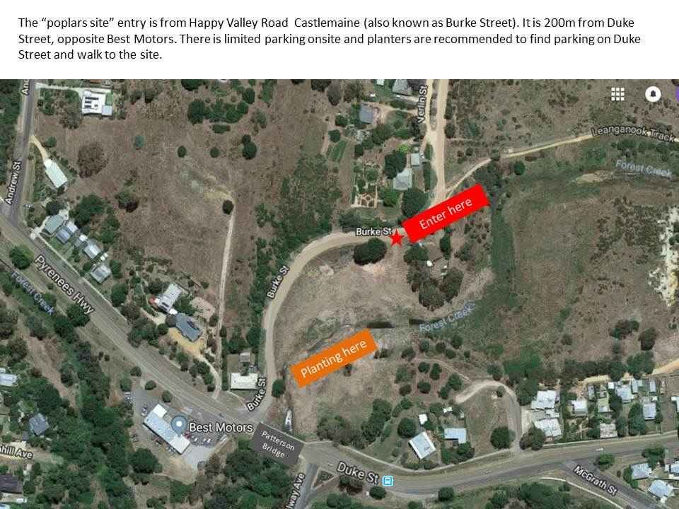 There is limited parking available on Happy Valley Rd (also called Burke St) but you may be better off parking on Pyrenees Highway and walking 200 m to the planting area.