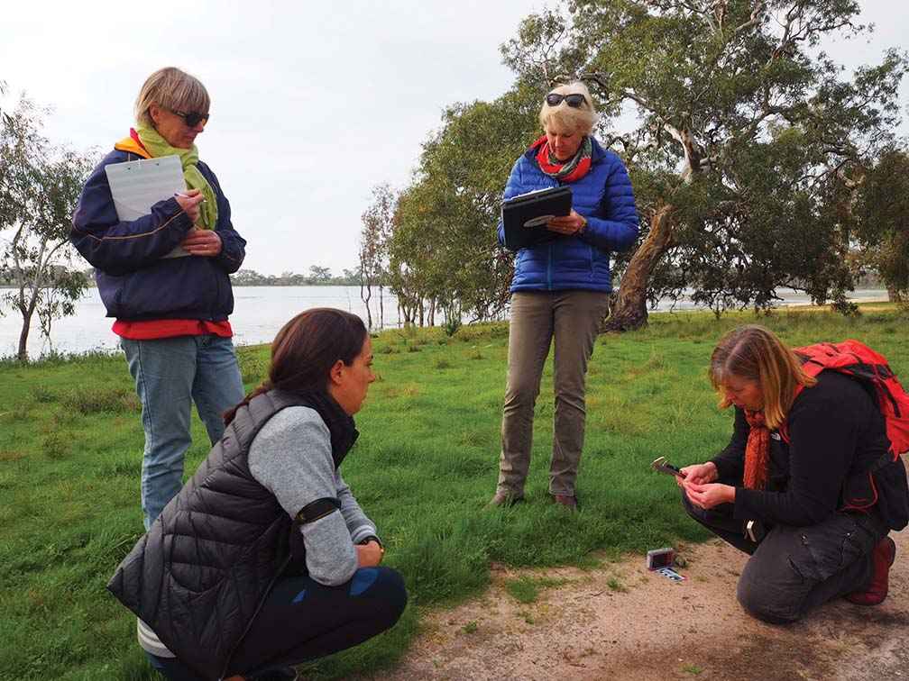 Above: Tori Simpson, Jenny Guthrie and Prue McAllister from the Avon Plains Banyena Landcare Group conduct a site survey at Walkers Lake with Dr Diana Smith from the Dja Dja Wurrung Clans Aboriginal Corporation.