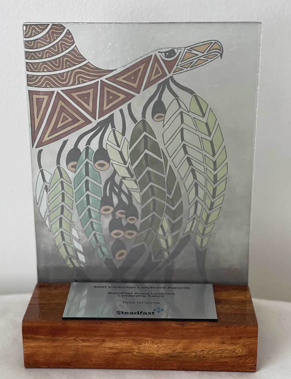 The trophy for the 2021 Victorian Landcare Awards features Taungurung artist Mick Harding’s Bundjil the Wedge Tailed Eagle, 2014.